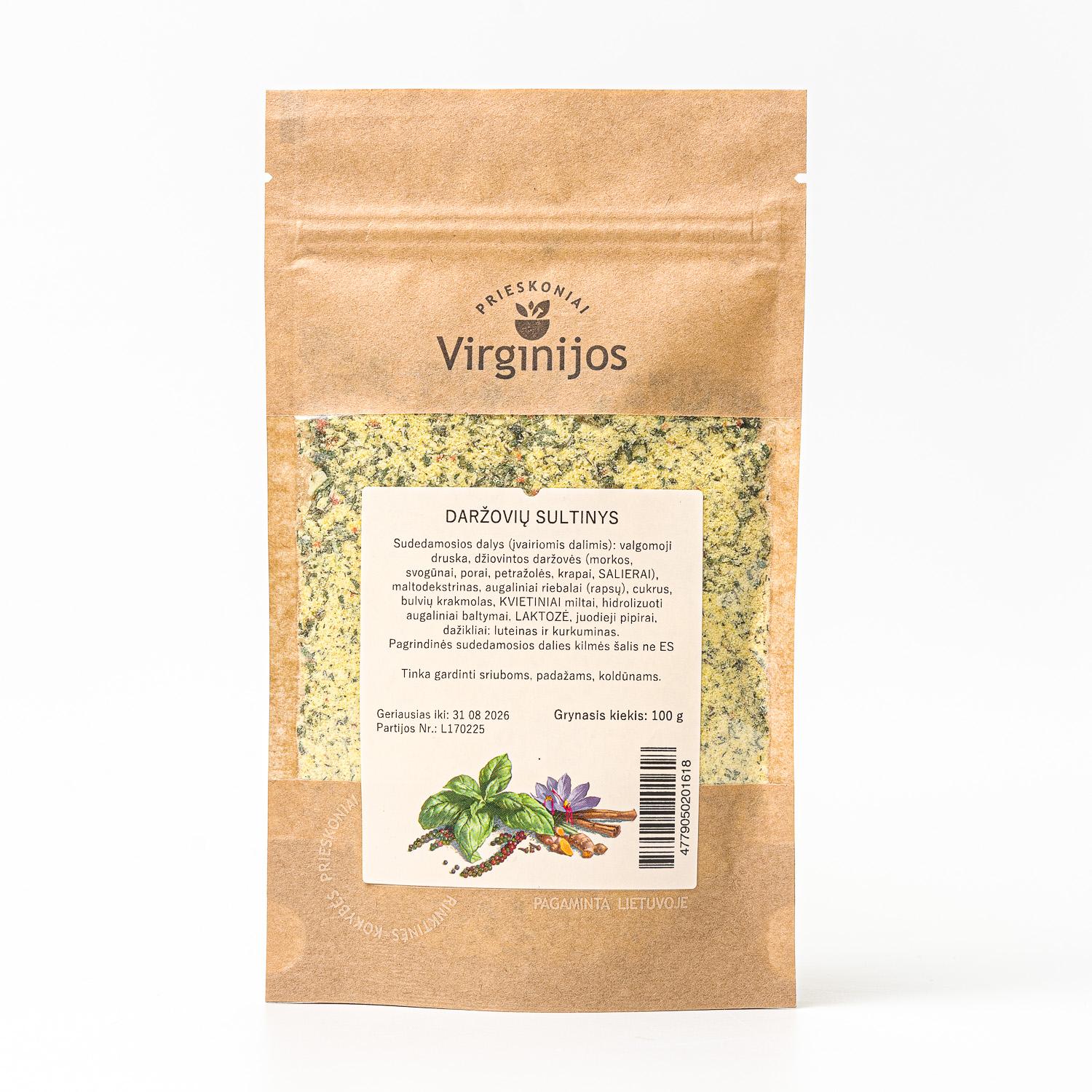 Sudedamosios dalys (įvairiomis dalimis): valgomoji druska, džiovintos daržovės: (morkos, svogūnai, porai, petražolės, krapai, SALIERAI), maltodekstrinas, augaliniai riebalai (rapsų), cukrus, bulvių krakmolas, KVIETINIAI miltai, hidrolizuoti augaliniai baltymai, LAKTOZĖ, juodieji pipirai, dažikliai: luteinas ir kurkuminas.