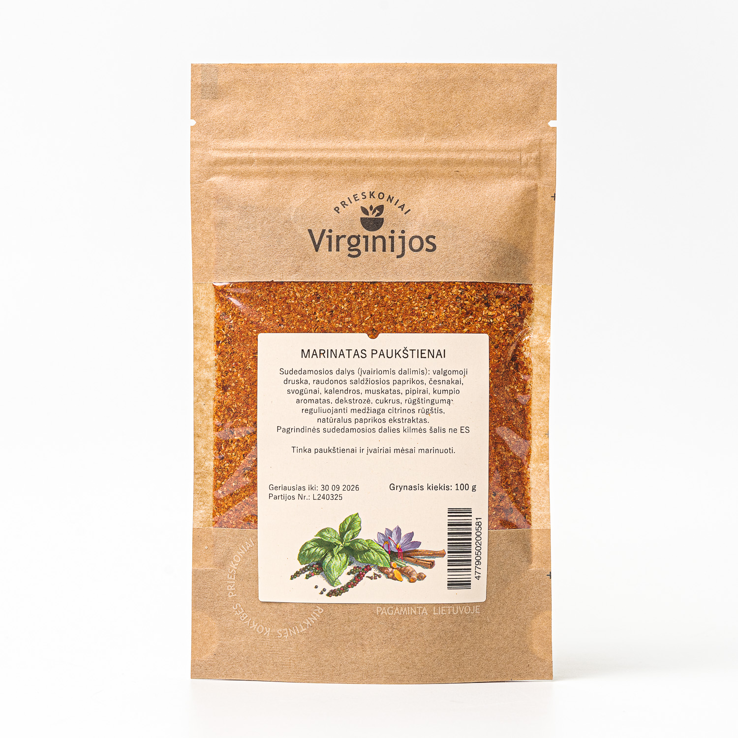 Sudedamosios dalys (įvairiomis dalimis): valgomoji druska, raudonos saldžiosios paprikos, česnakai, svogūnai, kalendros, muskatas, pipirai, kumpio aromatas (2%), dekstrozė (6%), cukrus, rūgštingumą reguliuojanti medžiaga citrinos rūgštis (1,5%), natūralus paprikos ekstraktas.