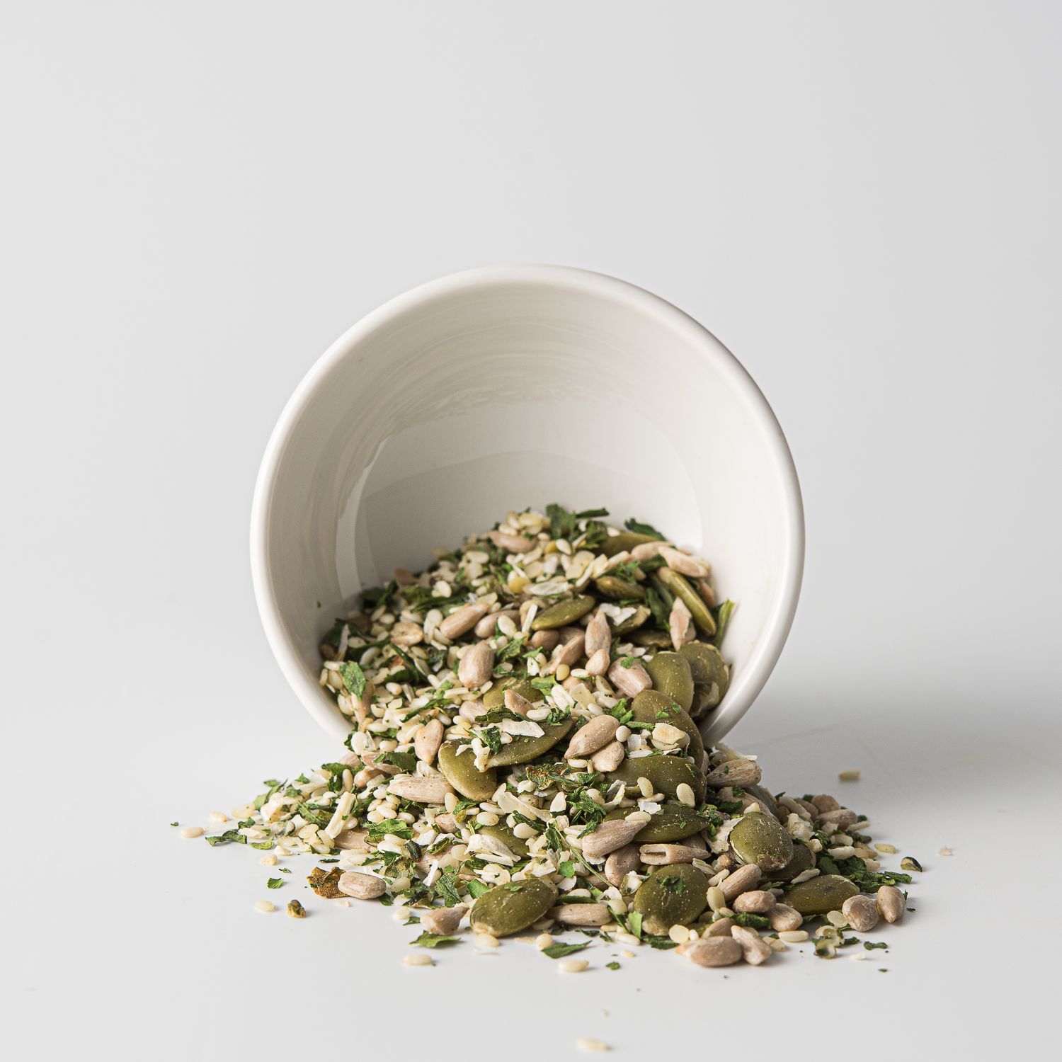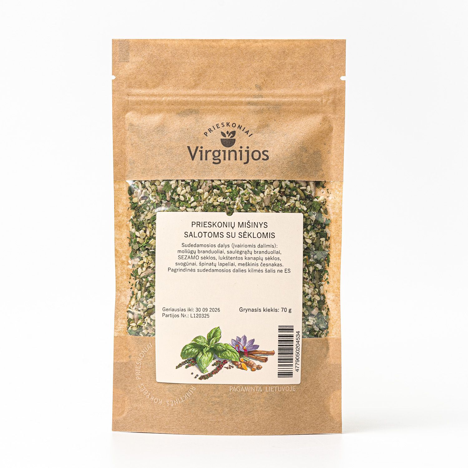 Sudedamosios dalys (įvairiomis dalimis): moliūgų branduoliai, saulėgrąžų branduoliai, SEZAMO sėklos, lukštentos kanapių sėklos, svogūnai, špinatų lapeliai, meškinis česnakas.